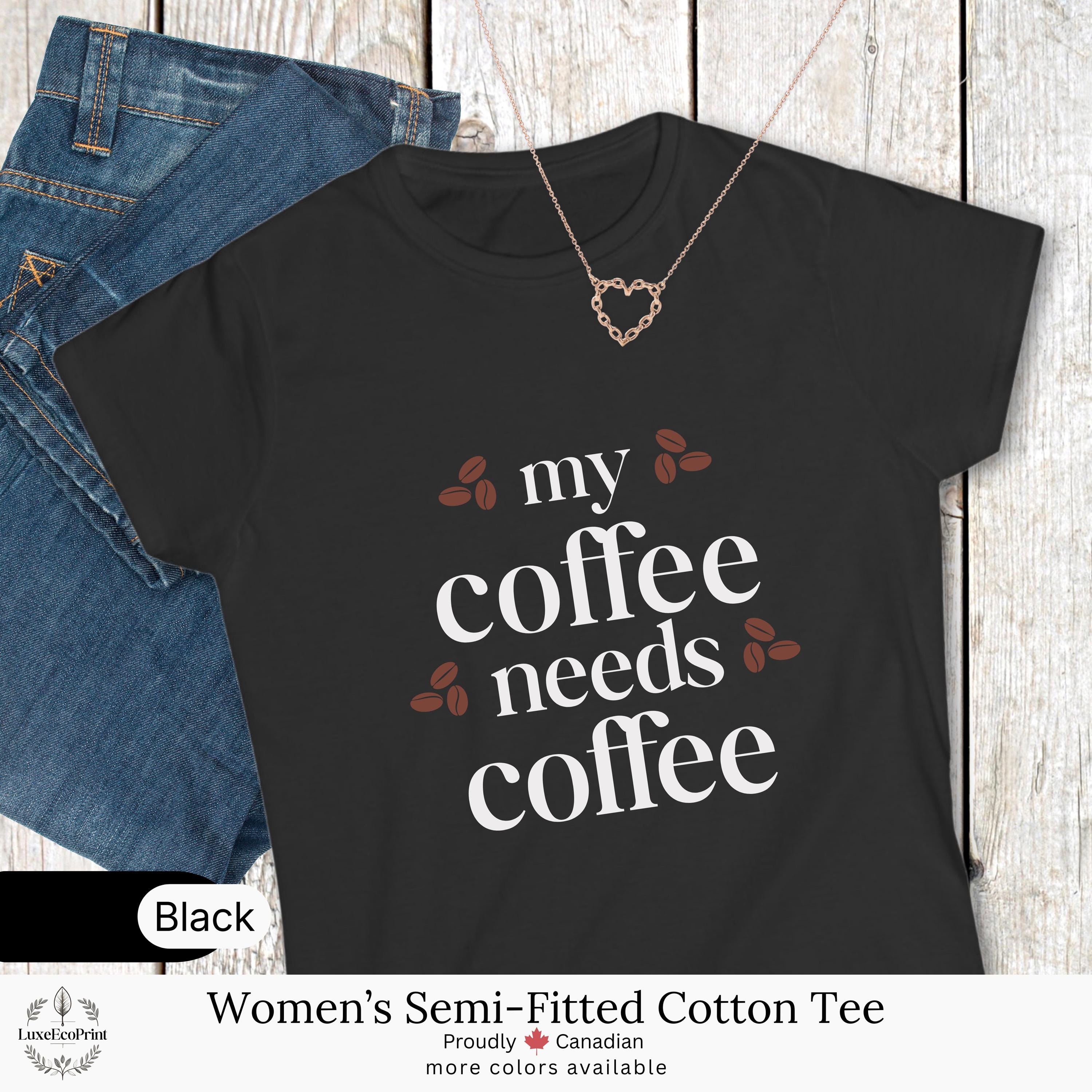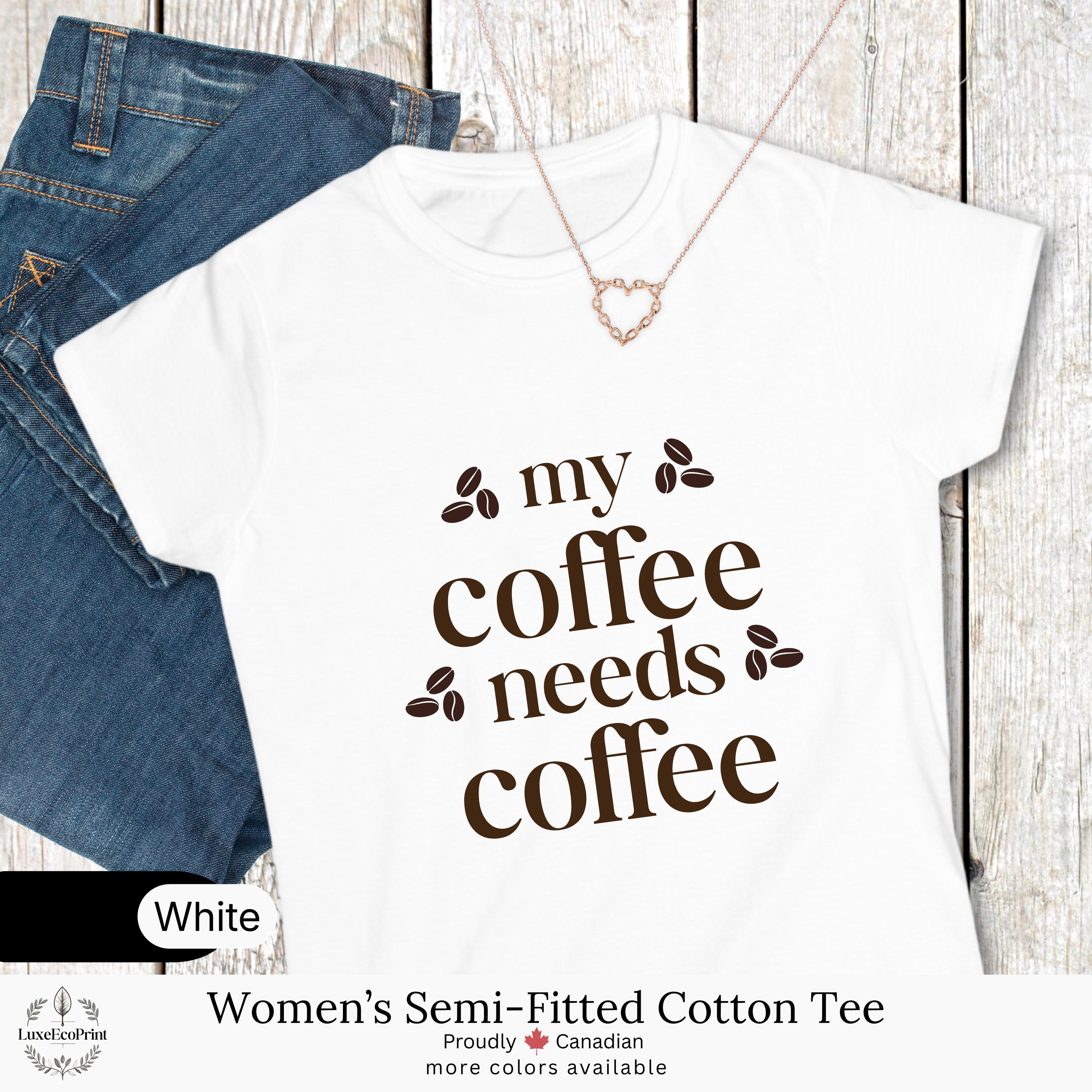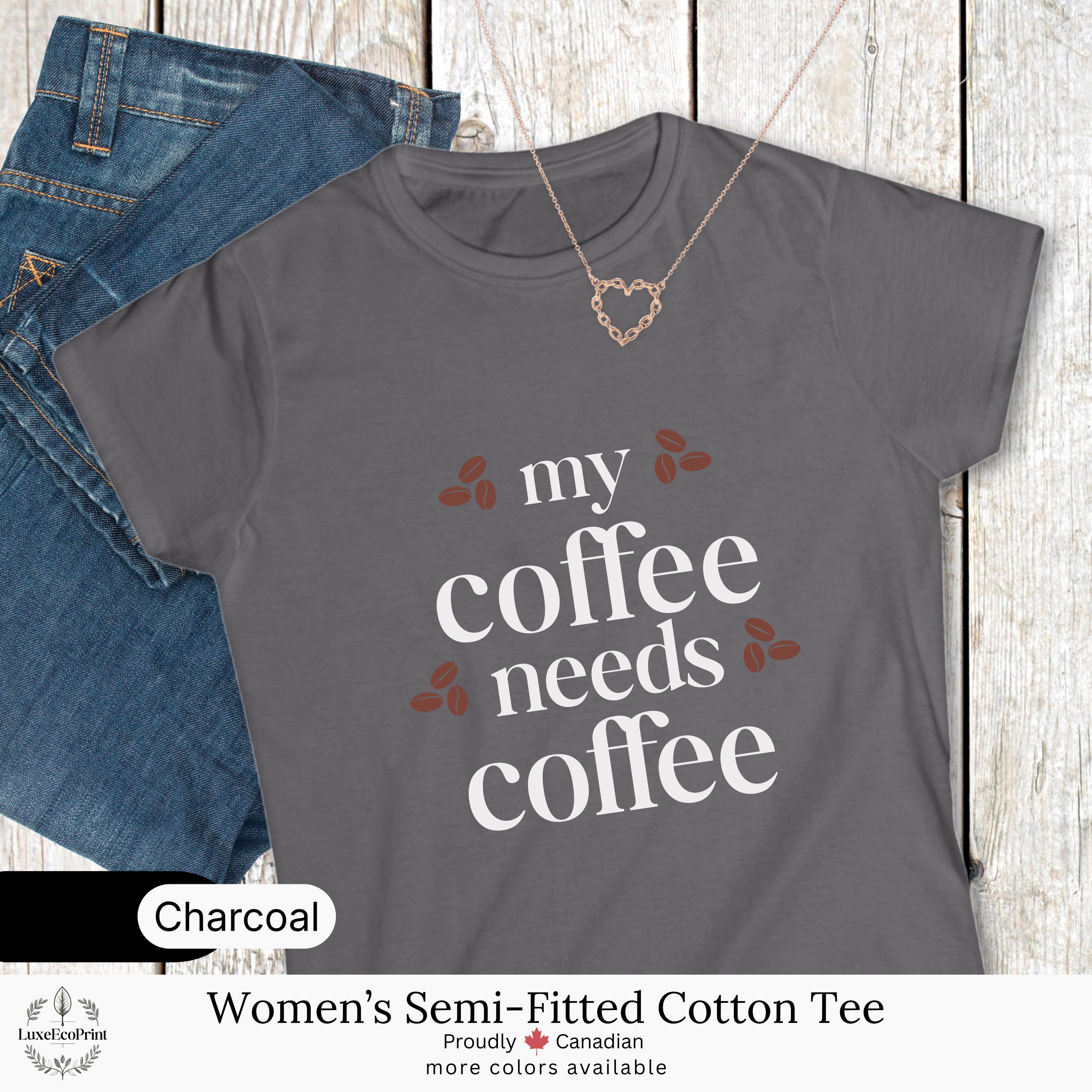 This women’s semi-fitted cotton t-shirt features a funny “My Coffee Needs Coffee” quote - a relatable design for caffeine lovers who take their brew seriously. It blends comfort, humor, and casual style for everyday Canadian fashion.