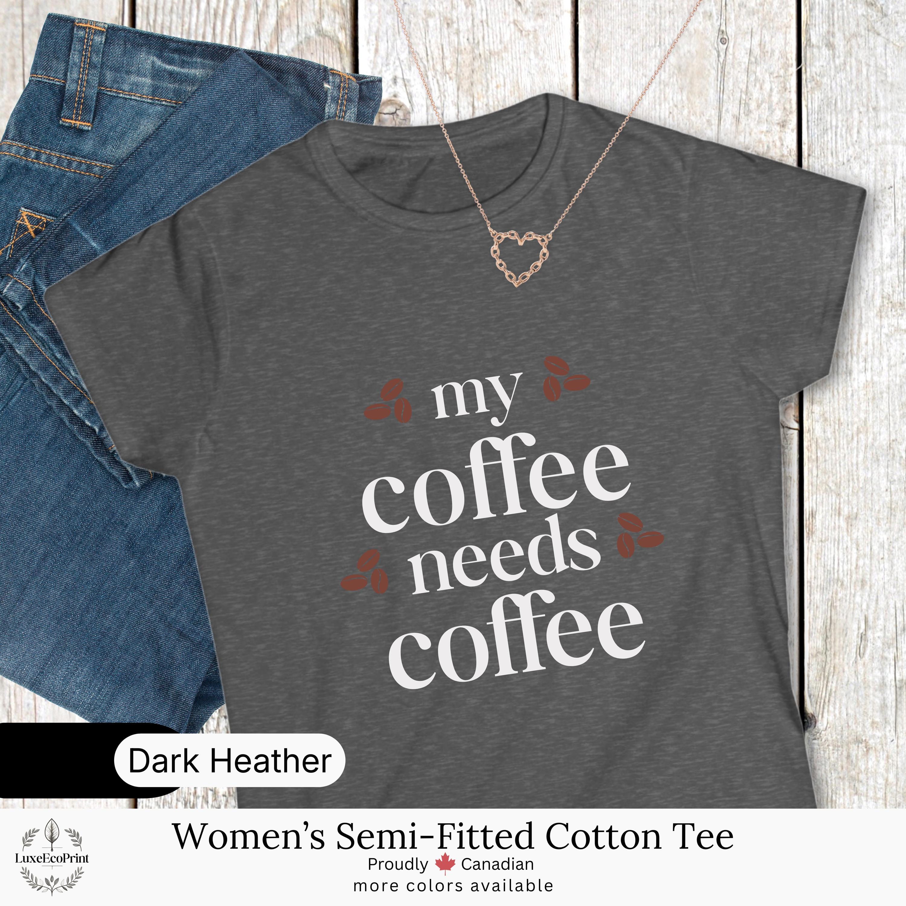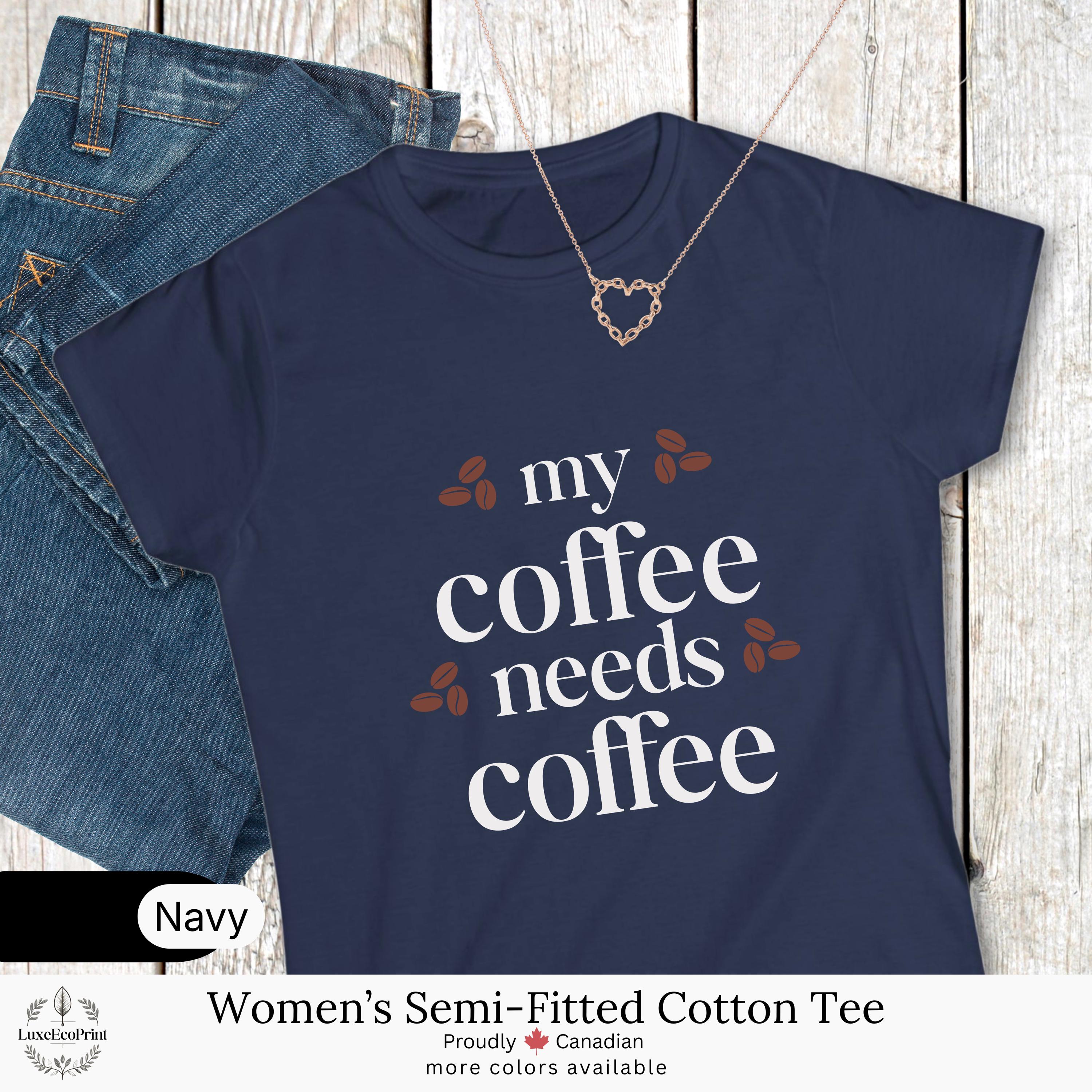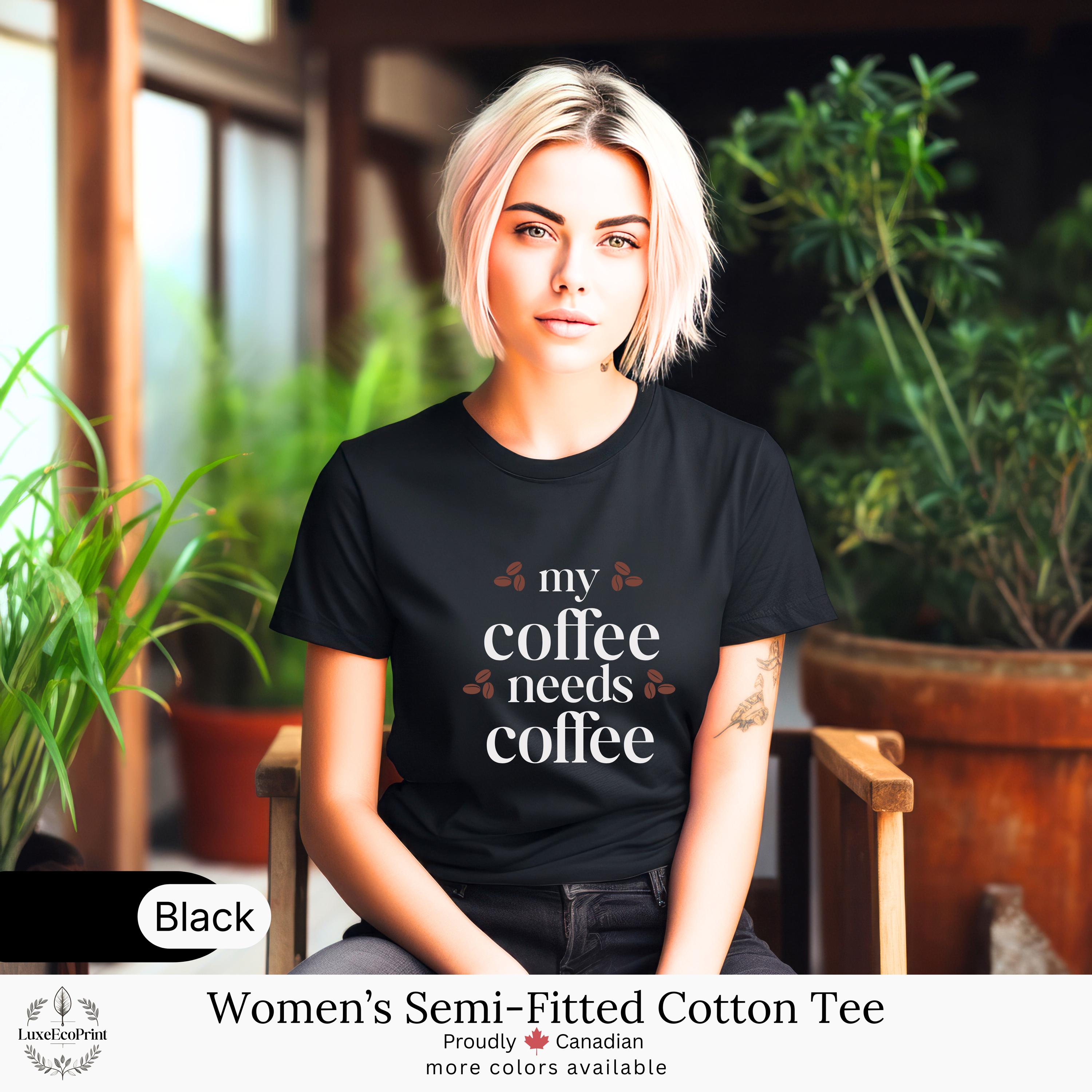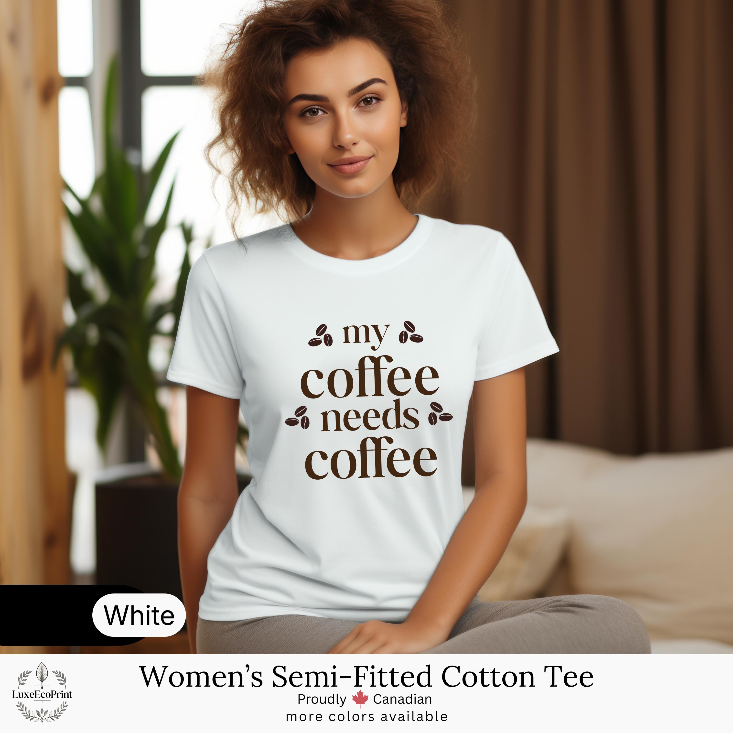 This women’s semi-fitted cotton t-shirt features a funny “My Coffee Needs Coffee” quote - a relatable design for caffeine lovers who take their brew seriously. It blends comfort, humor, and casual style for everyday Canadian fashion.
